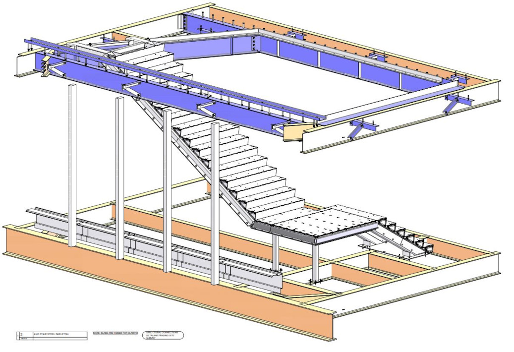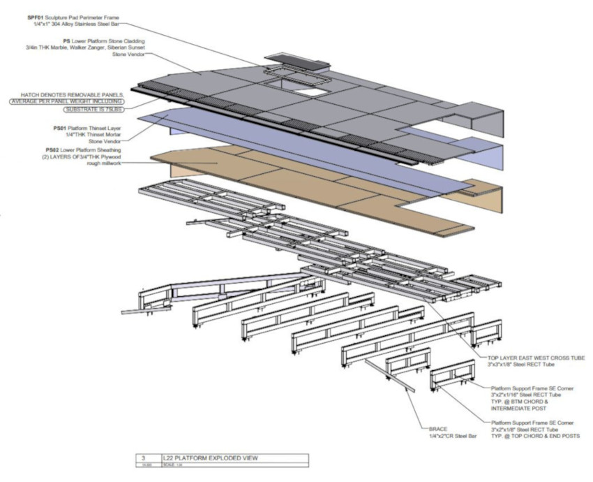 Feature stair built for a Manhattan law office with stone treads & platform, stainless steel cladding, and glass guardrail.