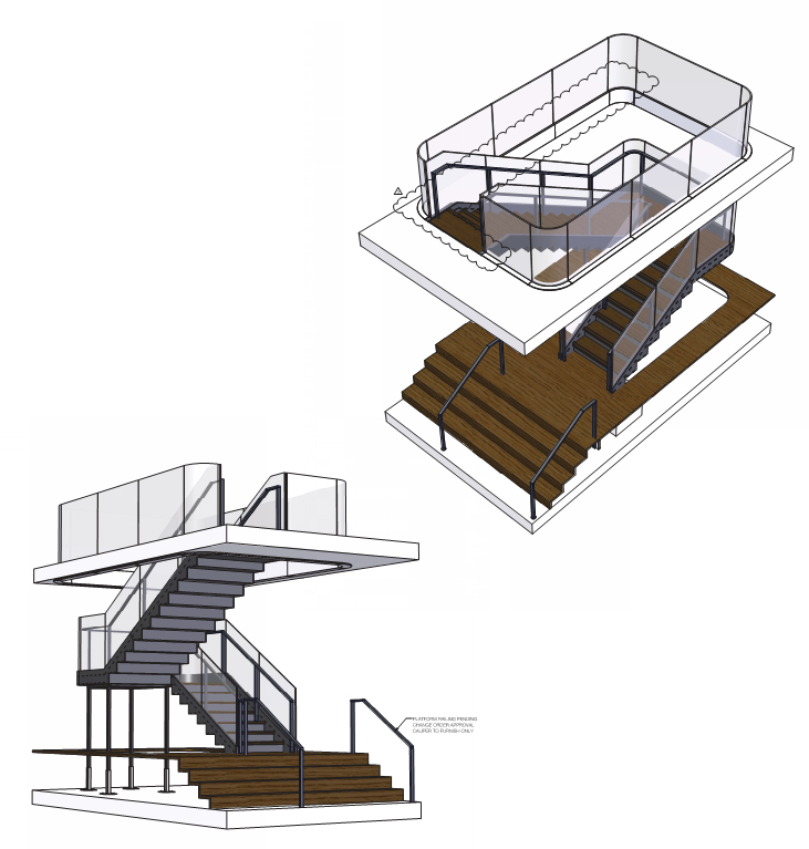 Feature stair at the Squarespace offices in Manhattan with integrated planters and curved glass.